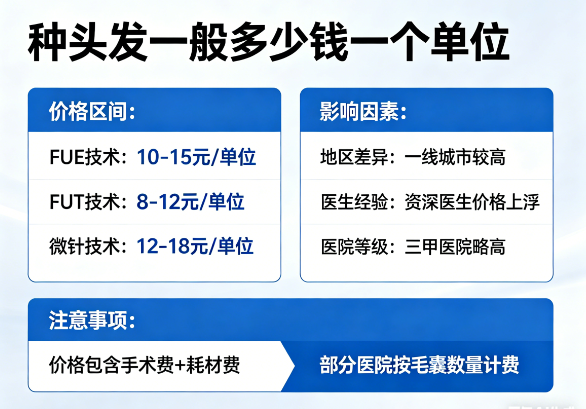 先给结论:目前市场行情,一个毛囊单位的单价普遍在8元到30元之间。 注意,是“毛囊单位”,不是“根头发”!一个毛囊单位里通常包含1-4根头发,这才是植发的收费基本单位。