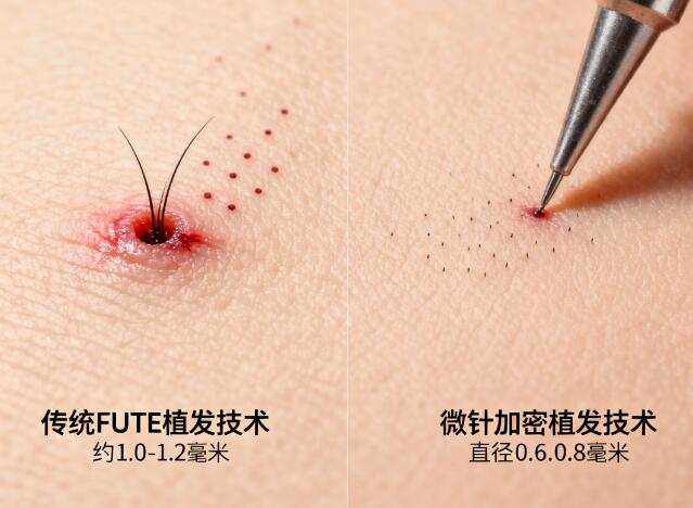 传统FUE需用宝石刀在头皮打孔后植入毛囊,创口直径约1.0-1.2mm,术后易形成微小血痂,恢复期需5-7天。而微针加密技术通过“种植笔+中空针头”一步完成打孔与种植,创口直径仅0.6-0.8mm,术后24小时即可冲洗,3天内血痂基本脱落,适合需快速回归社交的职场人群。