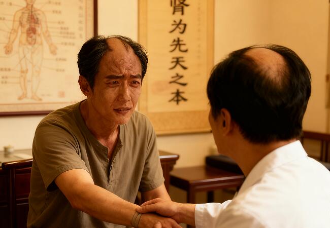 肾阴虚导致虚火上炎,扰乱毛囊代谢周期;肾阳虚引发阳气不足,毛囊生长功能衰退。雄激素性脱发患者中,78%存在肾阳虚体征。