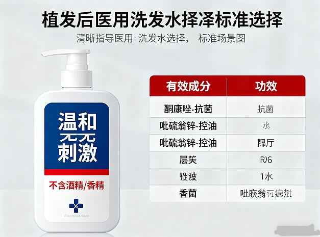 避免含酒精、人工香精、色素的配方。敏感头皮可选含甘草酸二钾的产品,其抗炎效果经临床验证,可缓解术后红肿瘙痒。