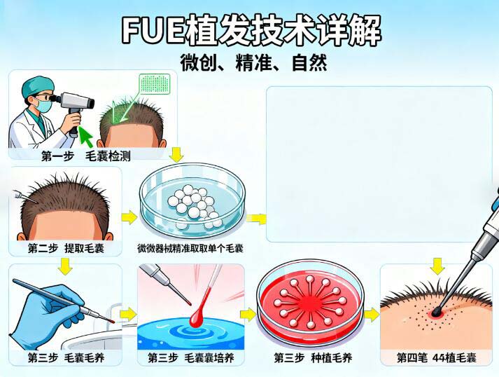 在毛发移植领域,FUE(Follicular Unit Extraction,毛囊单位提取技术)凭借其微创、高效、自然的特点,已成为全球主流的植发解决方案。本文将从技术原理、发展历程、临床优势、操作规范及未来趋势五大维度,系统解析FUE技术的核心价值与行业地位。