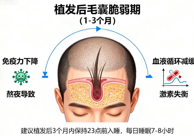植发后1个月内是毛囊的“黄金恢复期”,此时移植的毛囊尚未完全扎根,熬夜会引发三大危机: