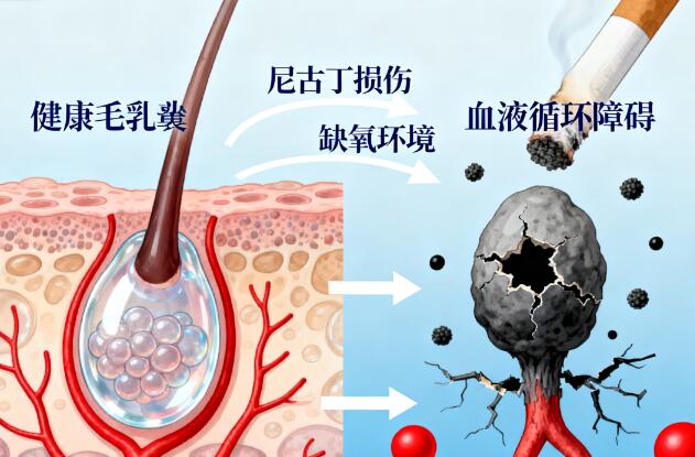 烟雾中的一氧化碳会与血红蛋白结合,形成碳氧血红蛋白,使血液携氧能力下降75%。同时,焦油中的多环芳烃会直接损伤毛囊干细胞,干扰毛发生长周期。长期吸烟者术后头皮油脂分泌旺盛,易堵塞毛囊孔,形成“油脂性脱发”与植发区稀疏的双重打击。
