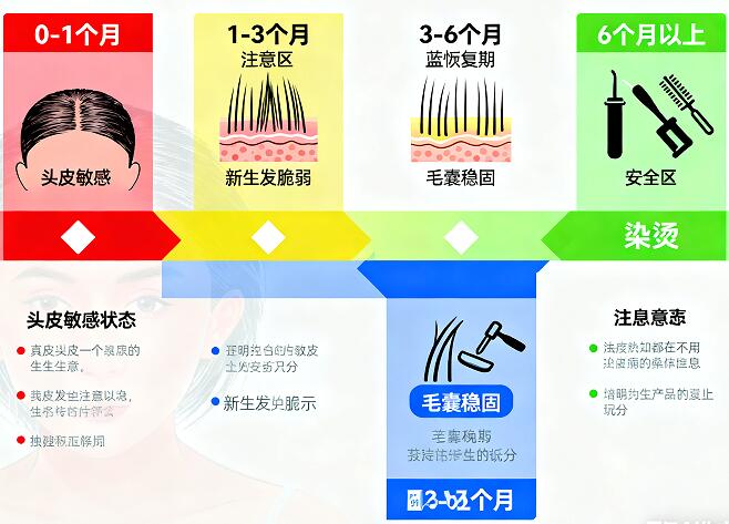 1-3个月:毛囊脆弱如“新生儿”,化学药剂可能引发毛囊炎、坏死,导致植发失败。