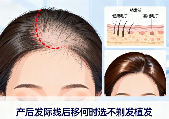 产后发际线后移是许多新妈妈面临的困扰,由于激素波动、精神压力及营养变化,前额头发稀疏成为常见问题。若不及时干预,可能影响形象与自信。不剃发植发作为现代恢复发际线的有效手段,选择正确时机至关重要。本文将从产后脱发原因、不剃发植发技术特点、理想植发窗口期及注意事项等方面,为你系统梳理科学应对方案。