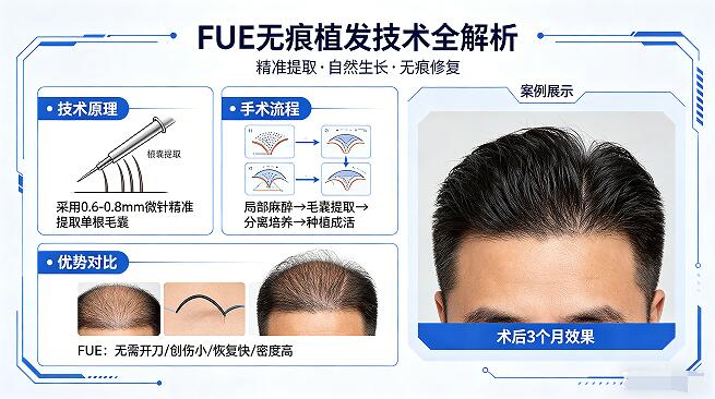 选择FUE技术需综合脱发面积、预算、医生资质三要素。建议提前进行专业毛囊检测,明确单位需求量,选择具备三甲医院背景或国际认证的机构。记住:技术先进≠效果完美,个性化方案设计才是关键。2026年,让科技与专业为您重拾自信秀发!