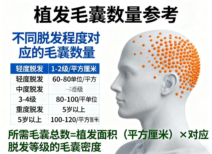 所需毛囊数量=脱发面积(cm²)×目标密度(FU/cm²)。