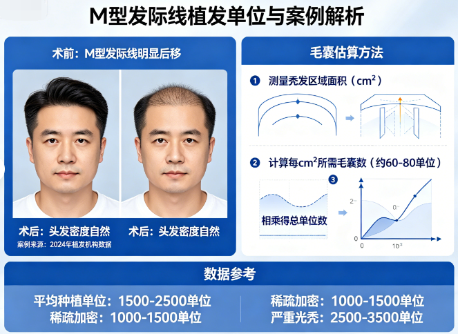 中度M型(标准M字):这是最常见的情况,额角后移明显,发际线呈清晰的M型。通常需要1500-2500个单位。比如上周刚回访的一位30岁IT男,M型脱发5年,两侧额角光溜,最后种了2640个单位,把“M”改成了“方圆形”,年轻了至少5岁。